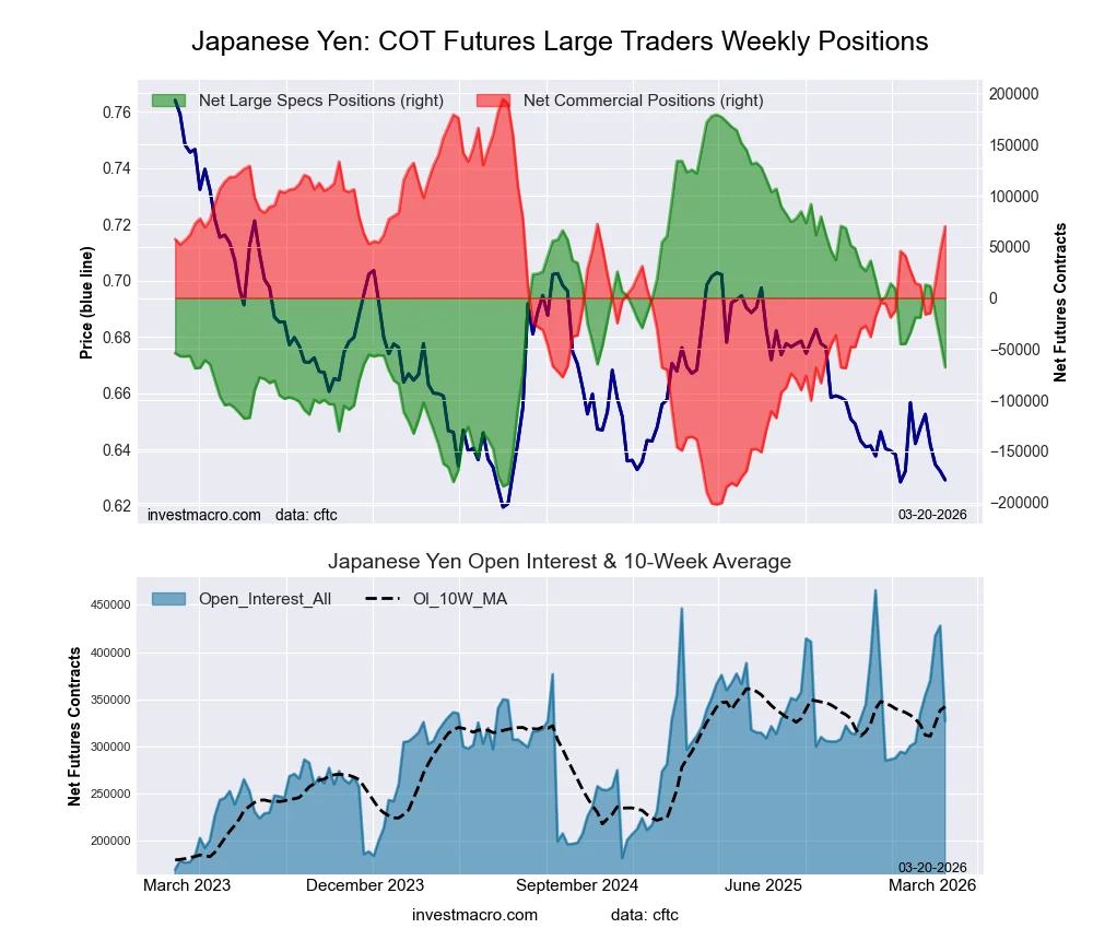 The Japanese Yen large speculator standing this week resulted in a net position of -67,780 contracts in the data reported through Tuesday. This was a weekly decrease of -26,393 contracts from the previous week which had a total of -41,387 net contracts.