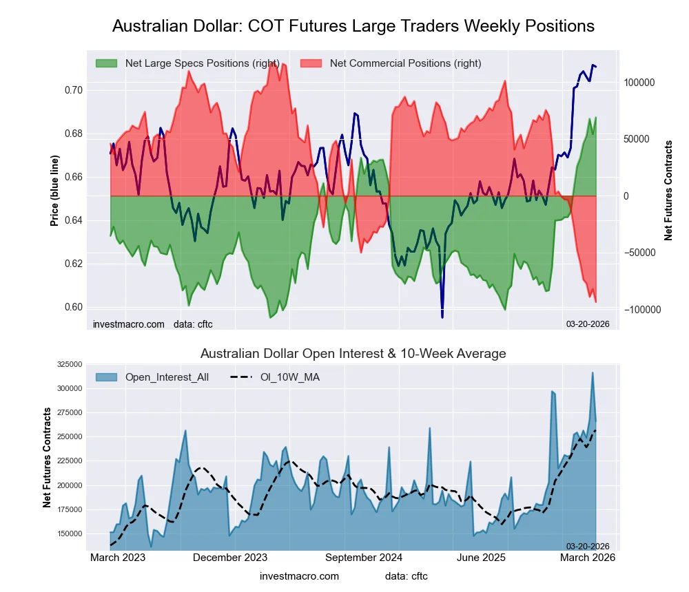 The Australian Dollar large speculator standing this week resulted in a net position of 69,061 contracts in the data reported through Tuesday. This was a weekly boost of 14,864 contracts from the previous week which had a total of 54,197 net contracts.