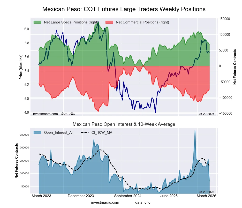The Mexican Peso large speculator standing this week resulted in a net position of 68,460 contracts in the data reported through Tuesday. This was a weekly decline of -5,351 contracts from the previous week which had a total of 73,811 net contracts.