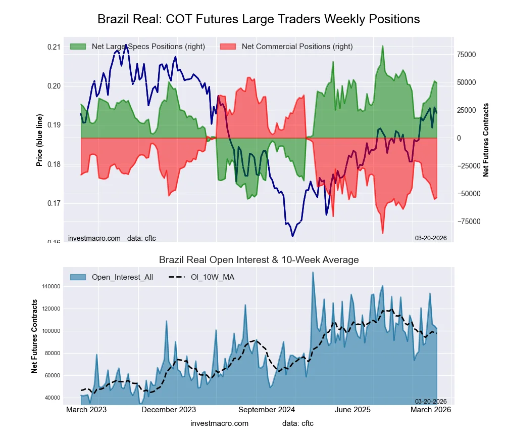 The Brazilian Real large speculator standing this week resulted in a net position of 49,317 contracts in the data reported through Tuesday. This was a weekly fall of -1,711 contracts from the previous week which had a total of 51,028 net contracts.