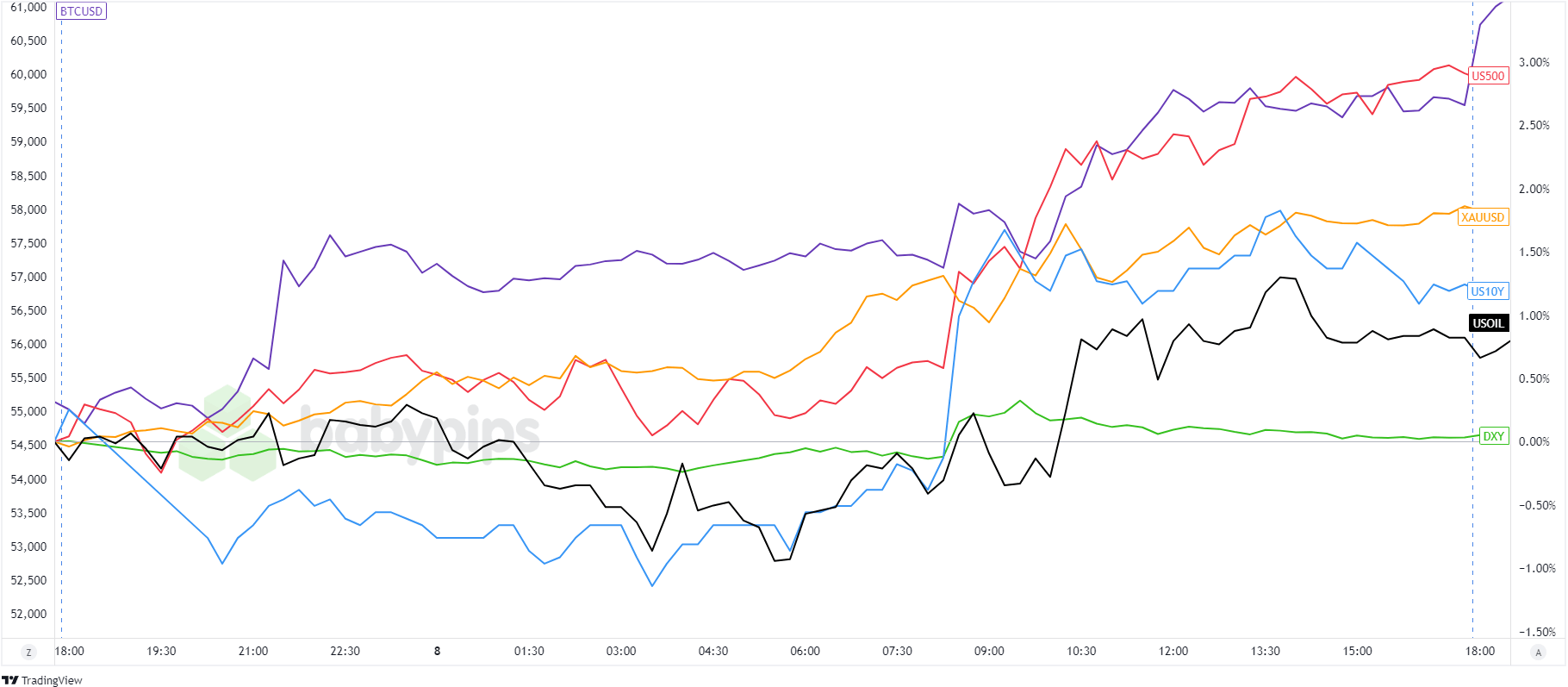 Dollar Index, Gold, S&P 500, Oil, U.S. 10-yr Yield, Bitcoin Overlay Chart by TradingView