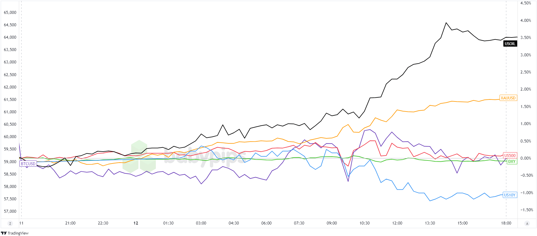 Dollar Index, Gold, S&P 500, Oil, U.S. 10-yr Yield, Bitcoin Overlay Chart by TradingView