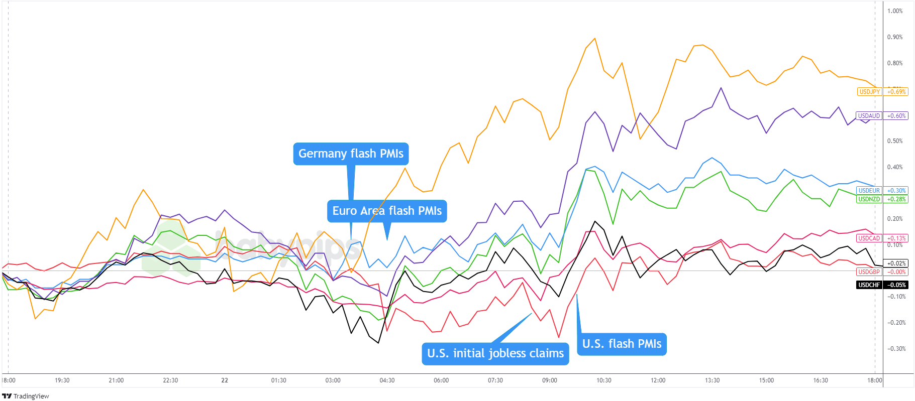 The focus then shifted to U.S. data during the U.S. session. The weekly initial jobless claims came in higher than expected, but new home sales improved, and the S&P Global Services PMI showed faster-than-expected expansion.