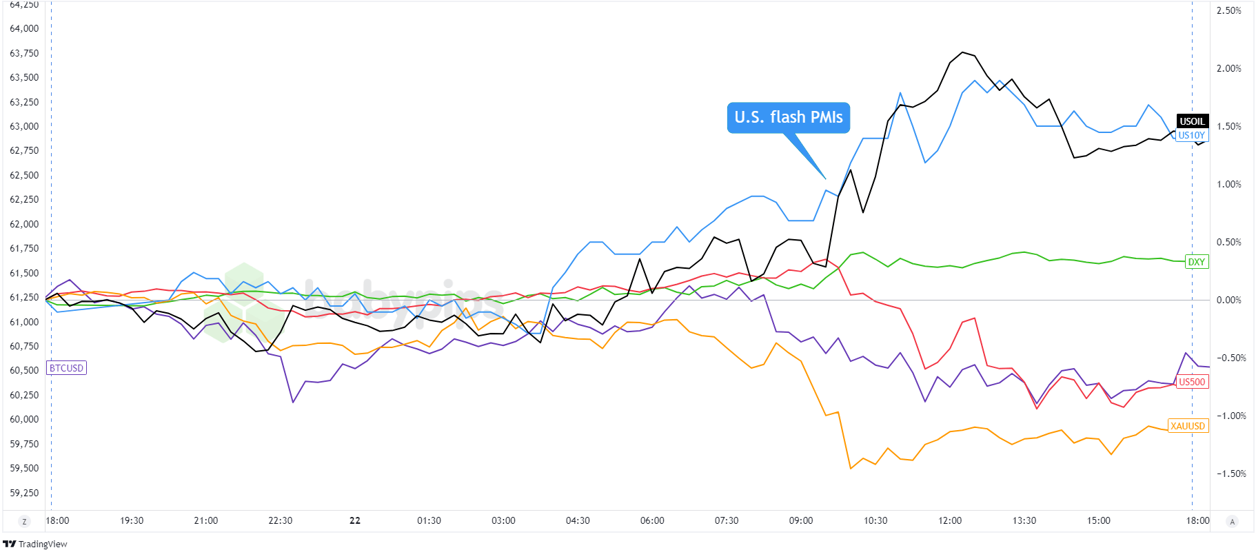 Dollar Index, Gold, S&P 500, Oil, U.S. 10-yr Yield, Bitcoin Overlay Chart by TradingView