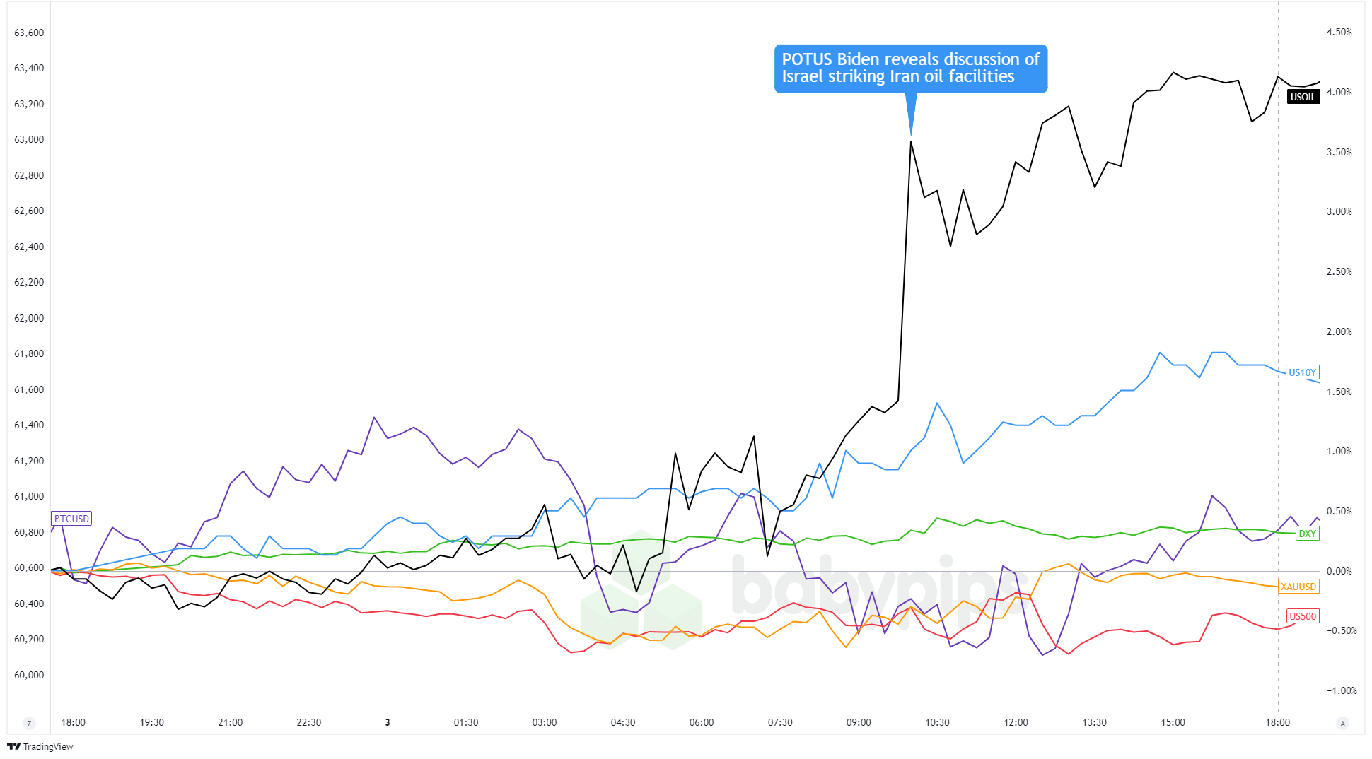 Dollar Index, Gold, S&P 500, Oil, U.S. 10-yr Yield, Bitcoin Overlay Chart by TradingView