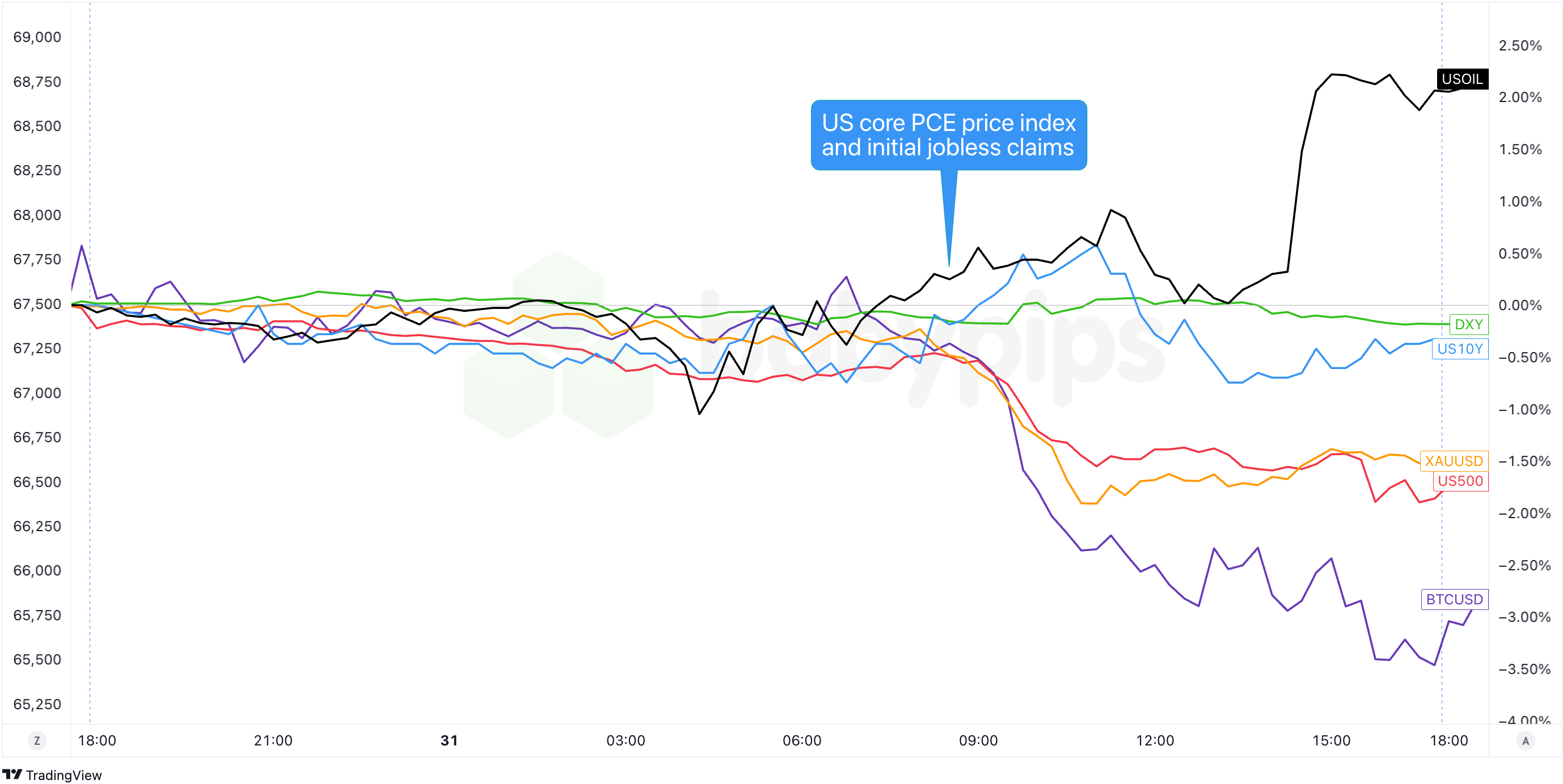 Dollar Index, Gold, S&P 500, Oil, U.S. 10-yr Yield, Bitcoin Overlay Chart by TradingView