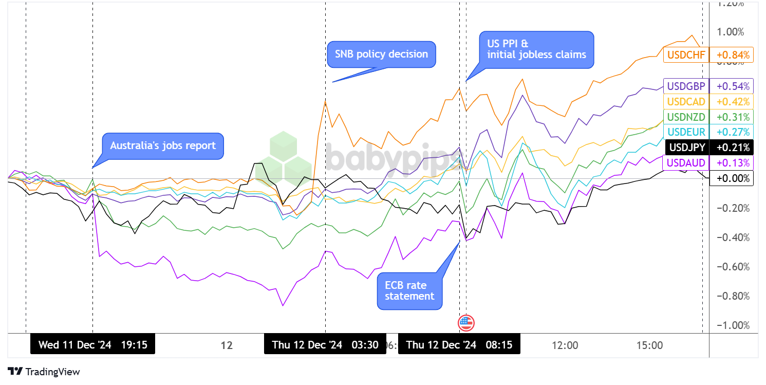 The Japanese yen also saw a bit of strength early in the day, likely driven by BOJ December hike hopes, although the safe-haven currency returned these winnings before London markets opened. USD/CHF staged a steep rally during the SNB decision, as the central bank surprised with a larger 0.50% rate cut, while the U.S. cruised higher across the board when risk-off flows picked up.