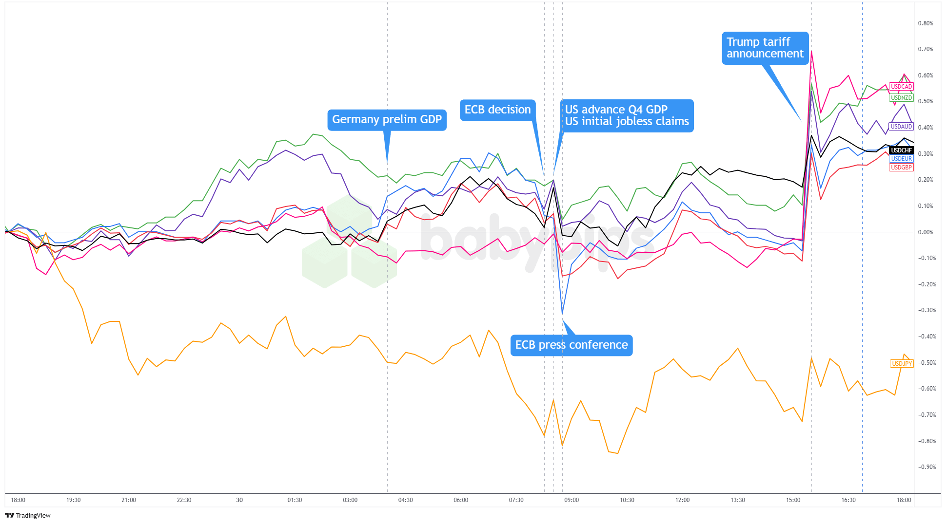 The U.S. session brought more volatility after Q4 GDP came in weaker than expected, while jobless claims showed strength. USD pairs saw sharp swings after Trump announced tariffs on Canadian and Mexican imports, but the currency ultimately found stability by late trading. The yen was the day’s top performer, while the euro edged lower, suggesting the ECB’s rate cut was already fully priced in.