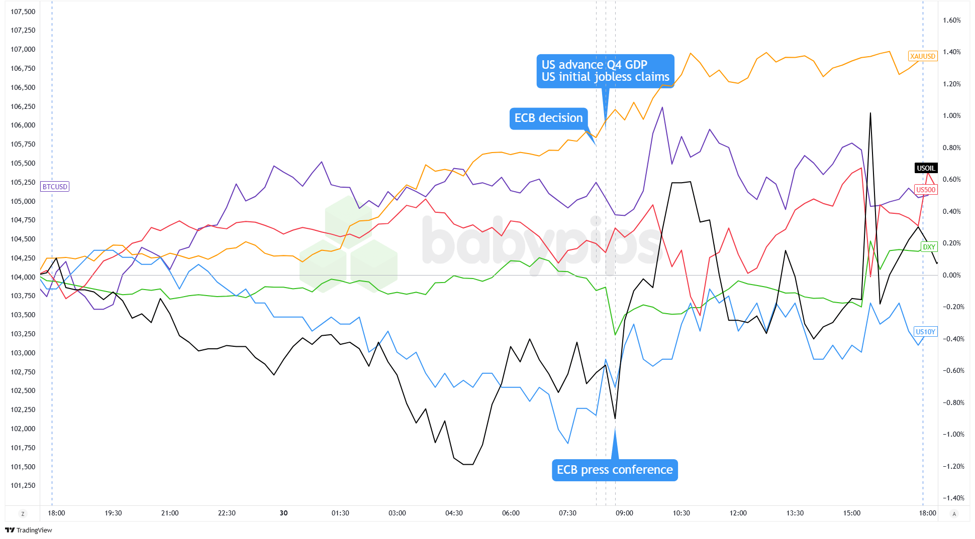 The major assets were all over the place after the ECB’s rate cut and Trump’s tariff threat on Canadian and Mexican imports. The ECB cut rates by 25 basis points to 2.75%—its fifth straight reduction—with Lagarde hinting at another cut in March as eurozone growth remains sluggish.