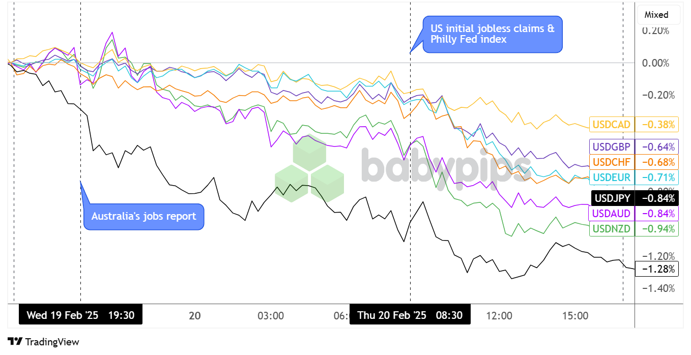 The Dollar Index (DXY) tumbled 0.75% to mark its third-largest drop since November 2024. The Japanese yen and New Zealand dollar led gains against the greenback, appreciating by 0.84% and 0.94% respectively. The Canadian dollar showed more modest gains, with USD/CAD falling 0.38%, while the Australian dollar caught a decent 0.84% gain, drawing additional support from upbeat jobs data.