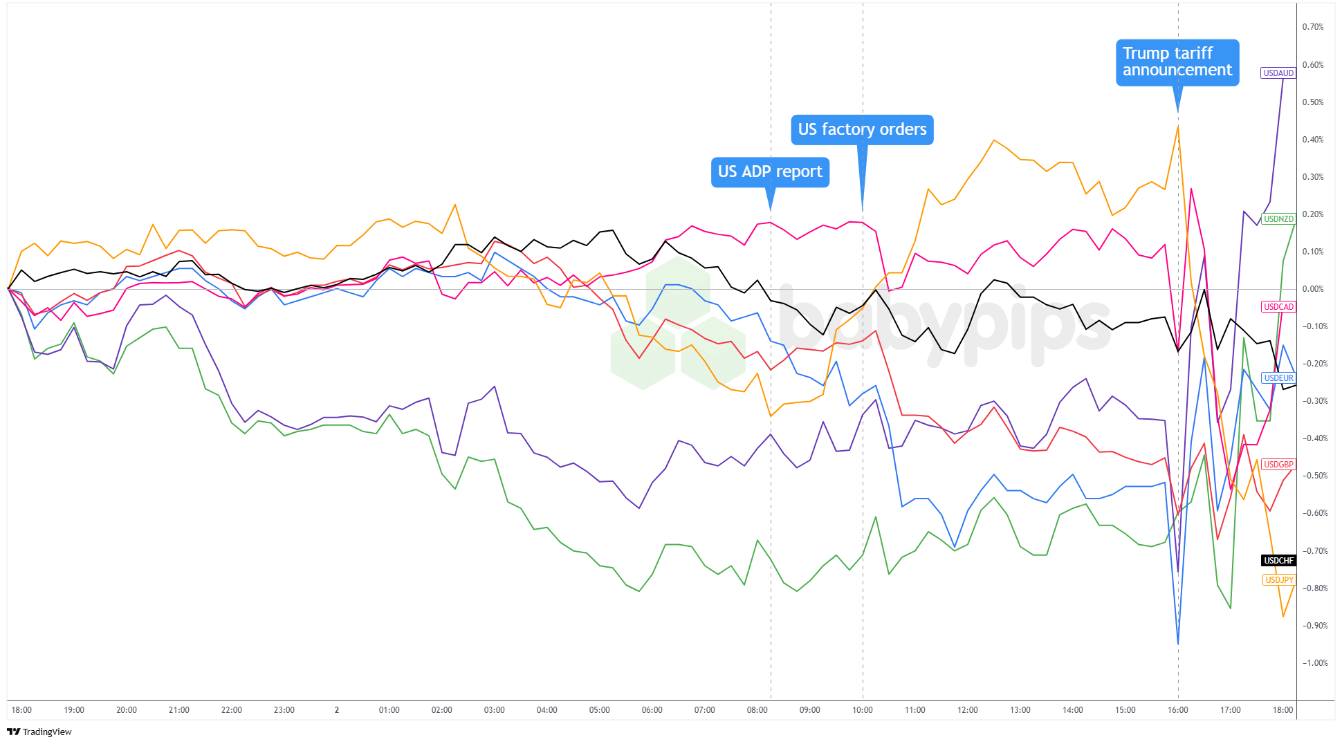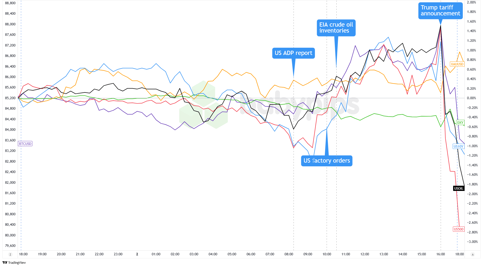 Trump’s tariff bombshell and a red-hot ADP jobs report sent shockwaves through the markets, flipping risk sentiment and jolting major assets.