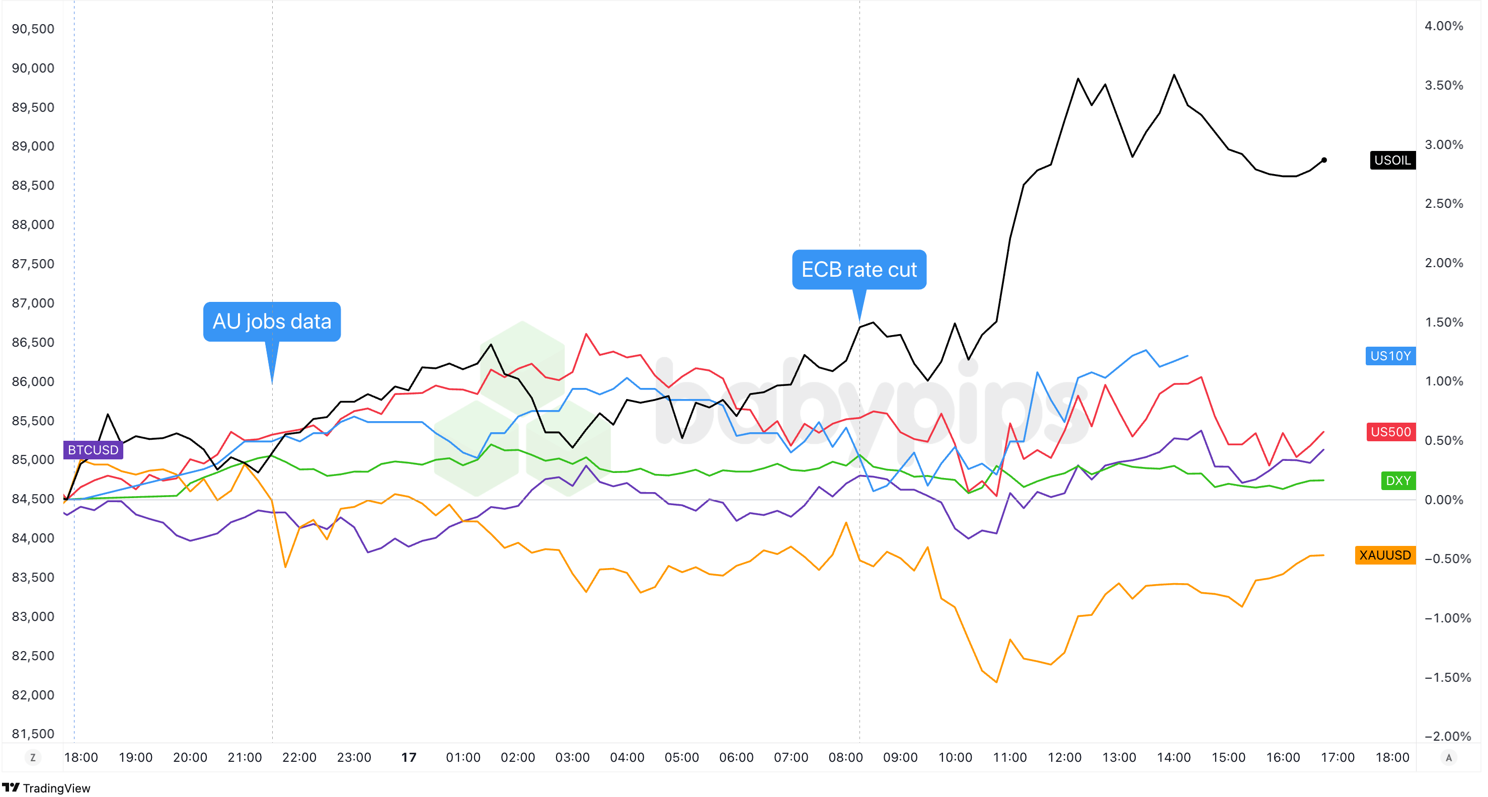 Dollar Index, Gold, S&P 500, Oil, U.S. 10-yr Yield, Bitcoin Overlay Chart by TradingView