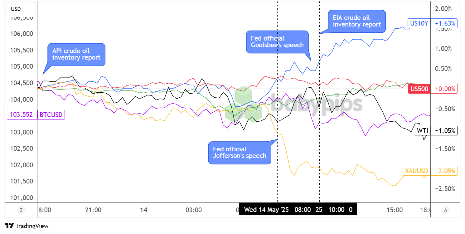 Bitcoin was also on the back foot, despite reports that companies like Tether and Strategy had been piling on their BTC holdings and Trump emphasizing that he’s “a big crypto fan,” leading BTC/USD to fall through the $104K barrier once more and edge close to $103,500 by session’s end.