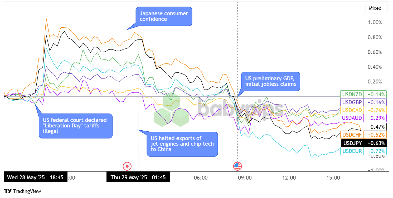 The dollar carried on with its downward trajectory as U.S. data came in mixed, with the preliminary GDP seeing a slight upward revision to show a smaller 0.2% contraction in Q1 2025 and the initial jobless claims coming in higher than expected. By session’s end, USD chalked up its largest losses against EUR (-0.72%) followed by safe-haven rivals JPY (-0.67%) and CHF (-0.52%).