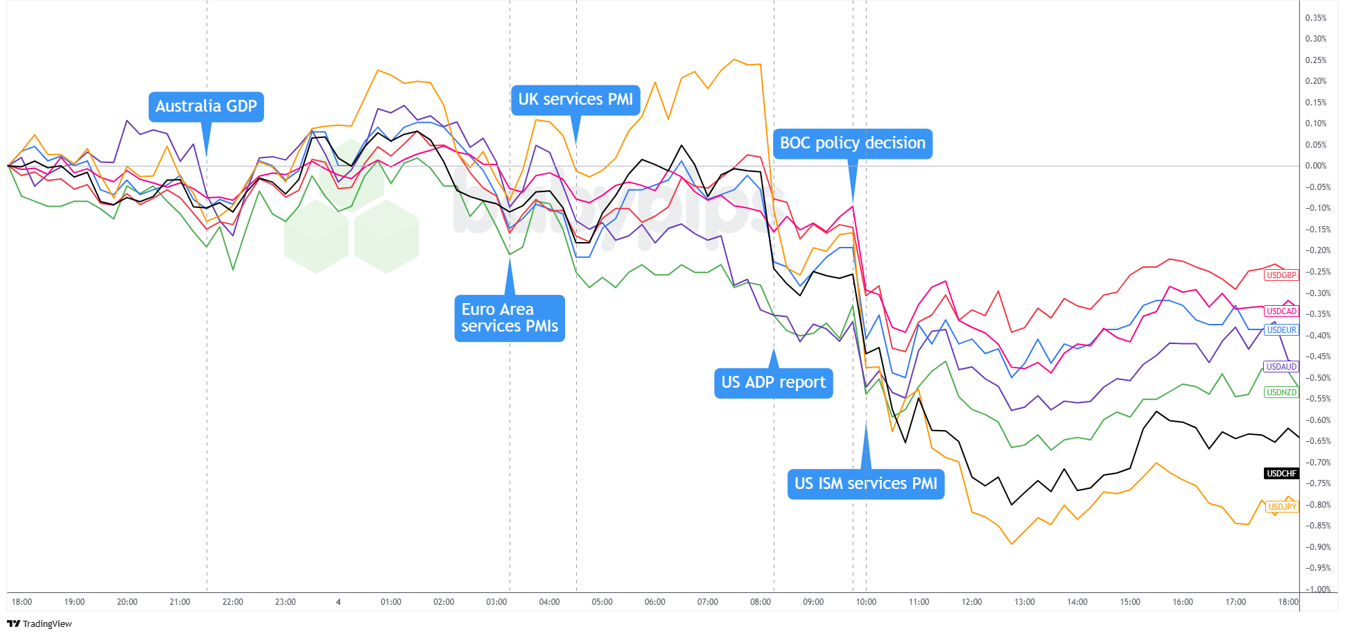 First up, weak U.S. data had traders leaning harder into the idea of Fed rate cuts. The ISM services index slipped into contraction at 49.9 when everyone was looking for a 52.0 print. ADP private payrolls were just plain ugly at 37,000 compared to 115,000 expected.