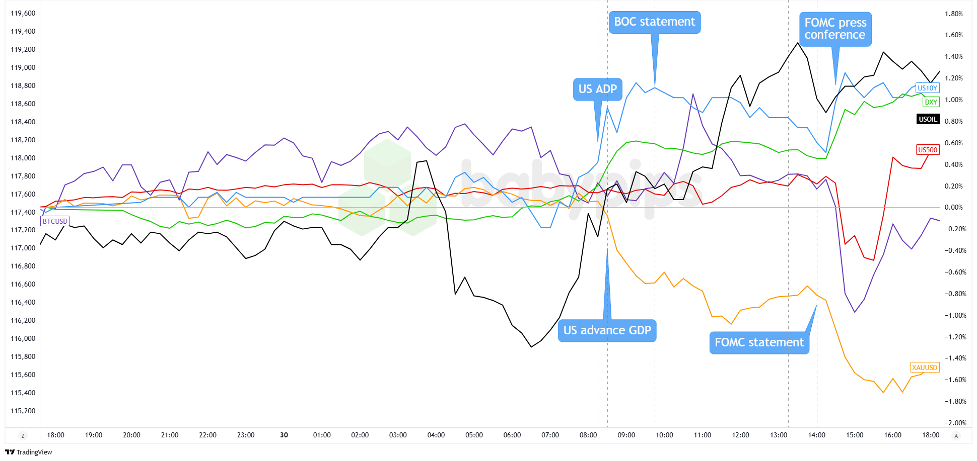 The major assets were all over the place on Wednesday as traders chewed on stronger-than-expected data and the Fed’s hawkish pause. In the Euro Area, second-quarter GDP ticked up 0.1% on the quarter, just a hair better than the flat reading expected. France’s 0.3% growth helped offset Germany’s 0.1% dip. Meanwhile, U.S. GDP came in hot at 3.0% annualized, beating the 2.5% forecast, though a good chunk of that pop came from unwinding the import distortions tied to first-quarter tariffs.