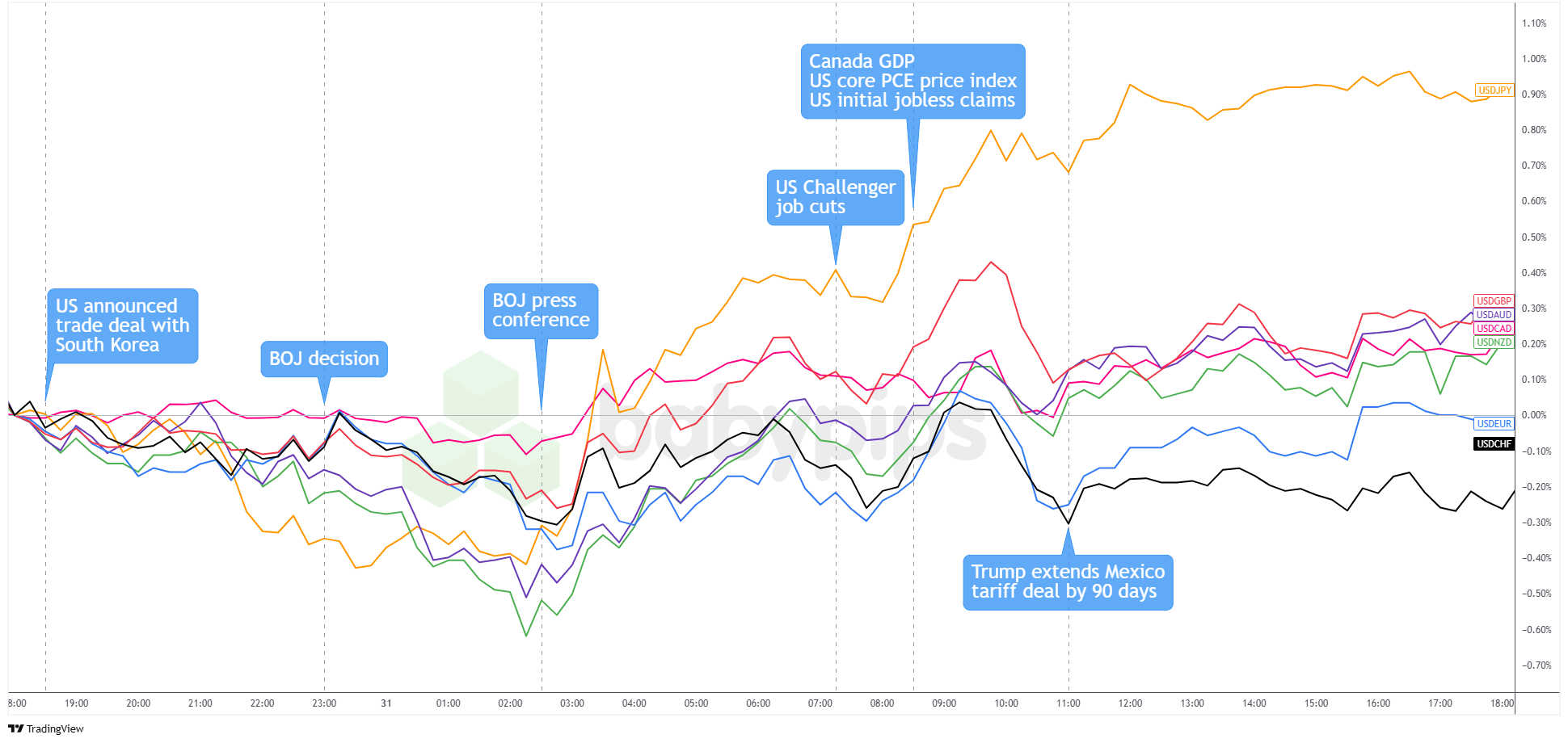 The dollar started Thursday on the back foot during Asian hours as traders took a cautious stance ahead of Trump’s midnight tariff deadline. Trade headlines set the early tone, with Trump announcing a deal with South Korea that included a 15% tariff rate, which offered a bit of relief to risk sentiment. USD/JPY saw some weakness out of the gate as markets reacted to the BOJ’s more upbeat economic outlook.