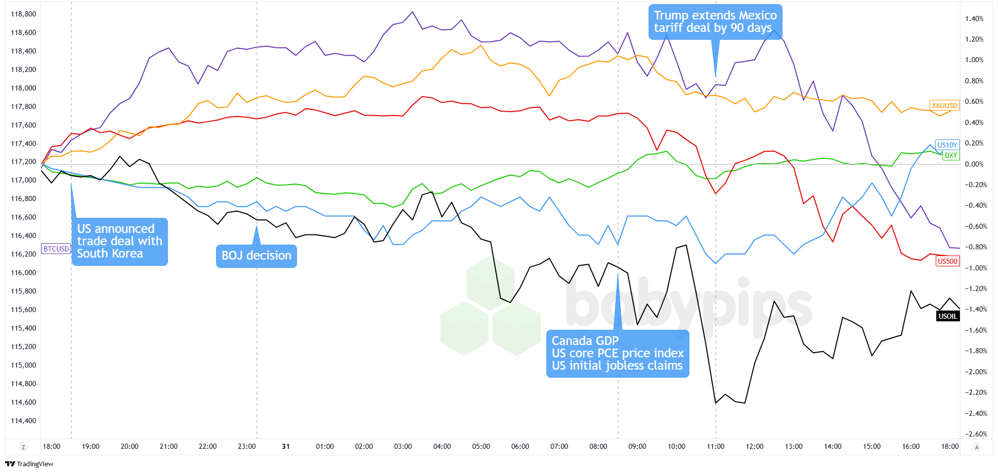 The major assets struggled for direction on Thursday as traders weighed upbeat earnings from Microsoft and Meta against rising tariff risks and month-end volatility.