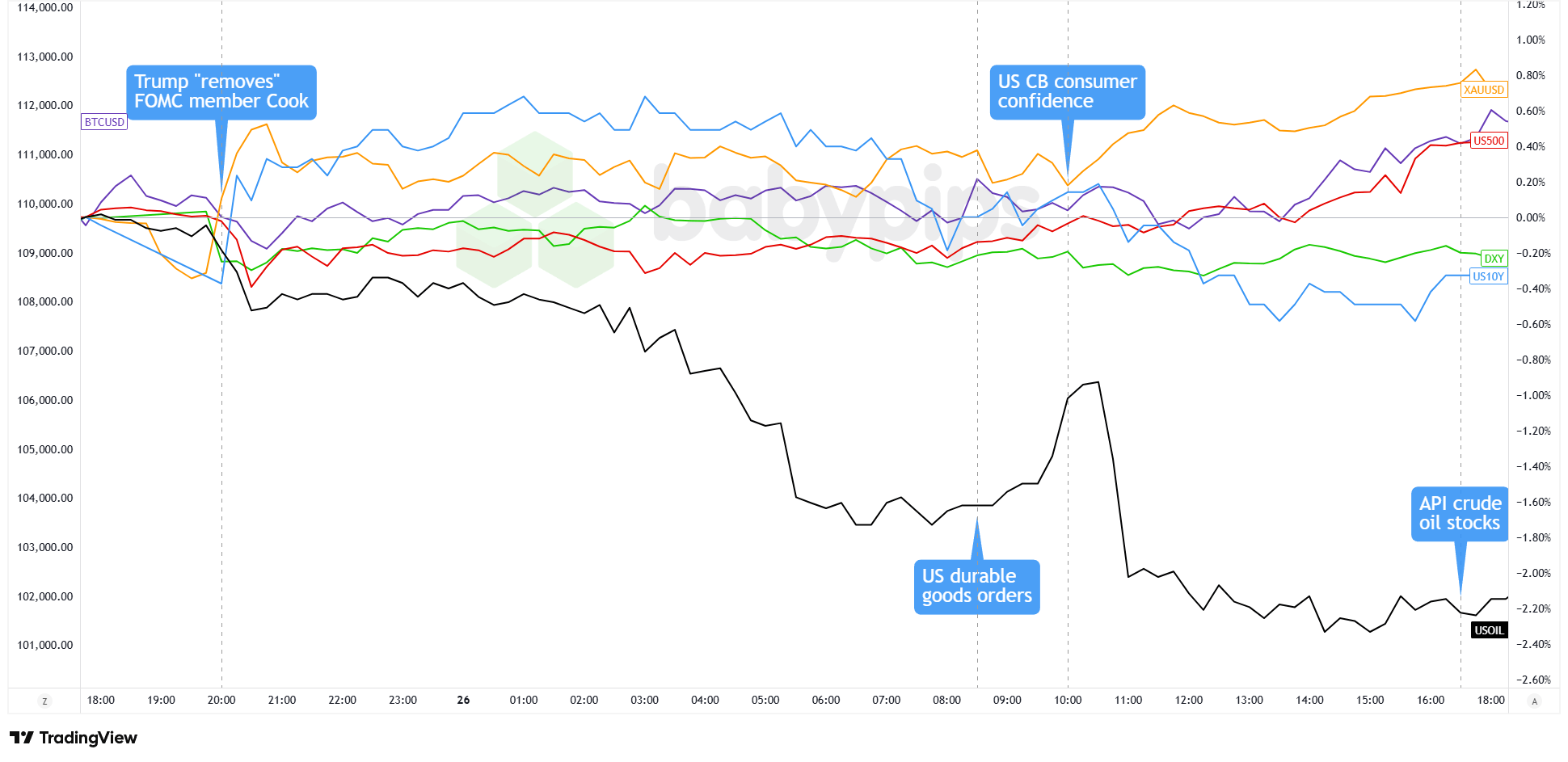 In New York, mortgage and oil stock data plus Fed speak could stir some price action, but overall volatility may stay limited while markets digest the Trump-Cook drama and wait for bigger catalysts.