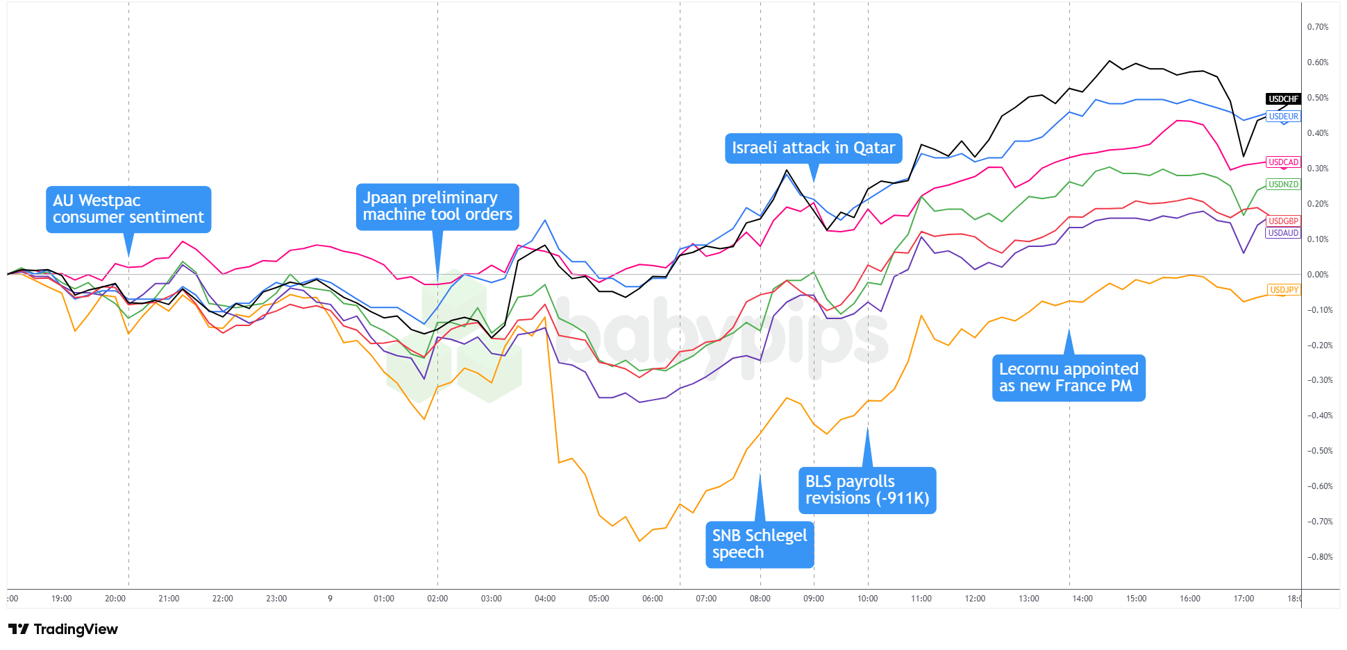 Early weakness persisted into the London session as markets digested overnight developments. However, momentum began shifting mid-session as Israel’s attack in Qatar sparked safe-haven demand and traders positioned ahead of key ECB decisions and Wednesday’s crucial US CPI data.