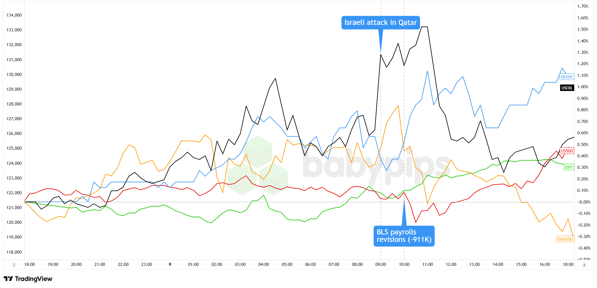 The major assets were all over the charts on Tuesday as markets navigated a complex backdrop of weak labor data and geopolitical tensions.