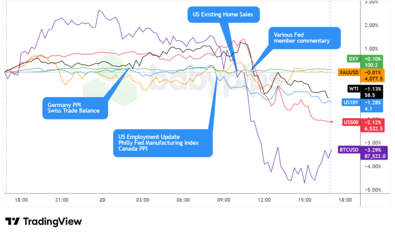 Gold traded nearly flat on the session, settling just 0.01% lower at $4,077.5 per ounce. The precious metal showed resilience during the Asian session decline but failed to capitalize on the afternoon’s risk-off move, possibly as the hawkish Fed rhetoric and rising real yields offset traditional safe-haven demand.