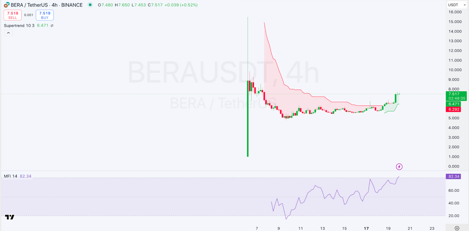 Berachain, $BERA, is also among the gainers in today’s session as also seen from its price movements. Looking at an in-depth analysis, we see that BERA has surged and is trading at $7.517, above the Supertrend support of $6.471. A clear bullish trend as the price remains above the green Supertrend line.