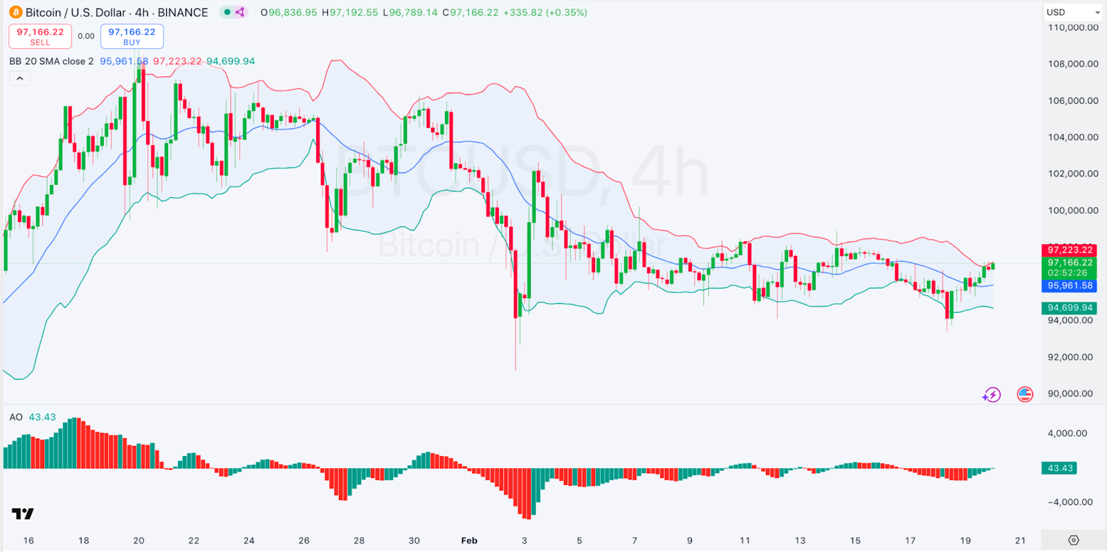On the other hand, we see that the Awesome Oscillator (AO) is showing a shift towards positive momentum, with green bars emerging after a prolonged bearish phase. Bitcoin traded at $97,232 as of press time, representing a 1.6% increase over the last 24 hours.