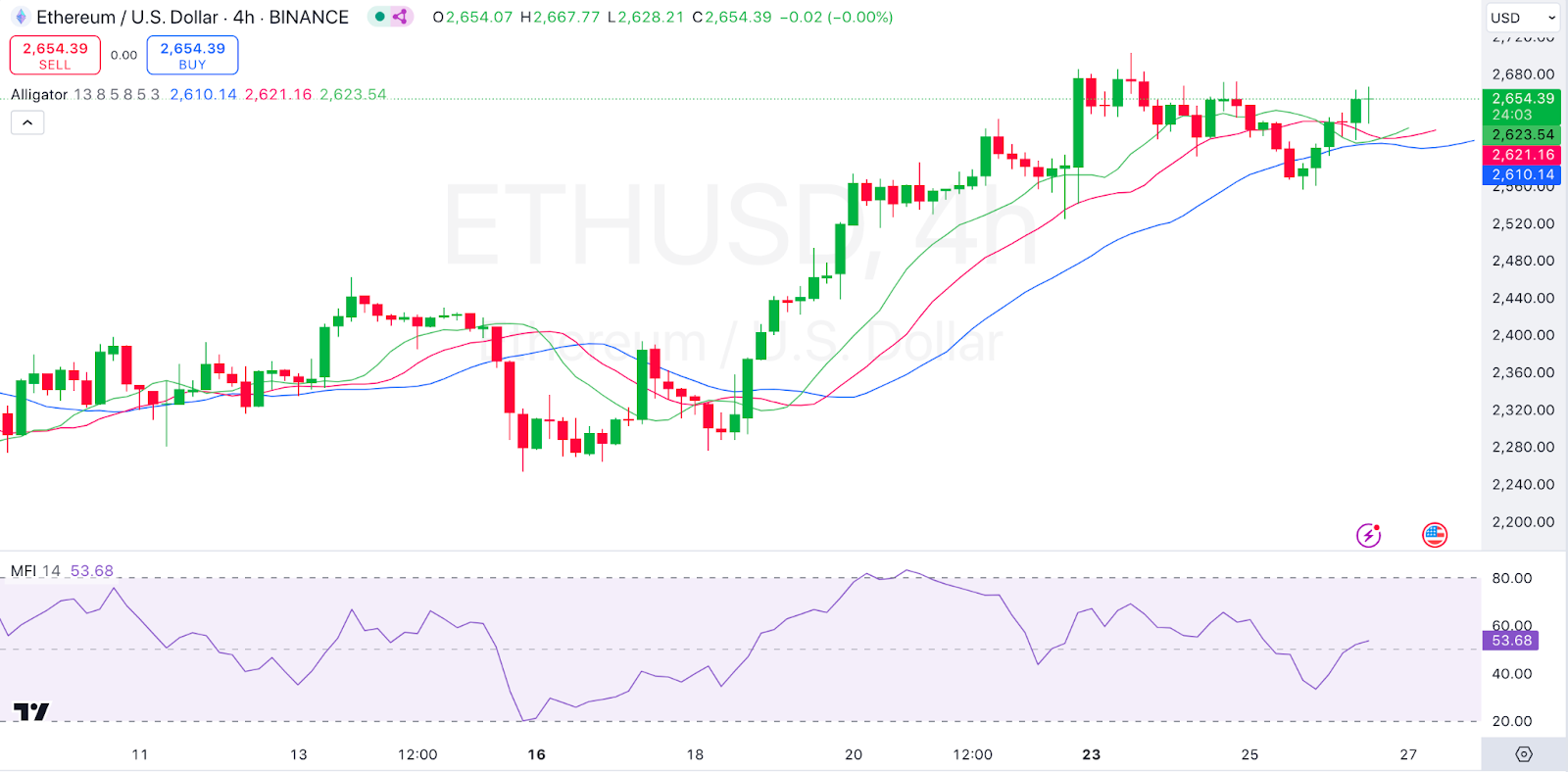 On the other hand, we see that the Money Flow Index (MFI)is currently at 53.68, the MFI suggests that buying and selling pressure are balanced, leaning slightly towards the buy side. Ethereum traded at $2,655 as of press time, representing a 3.04% increase over the last 24 hours.