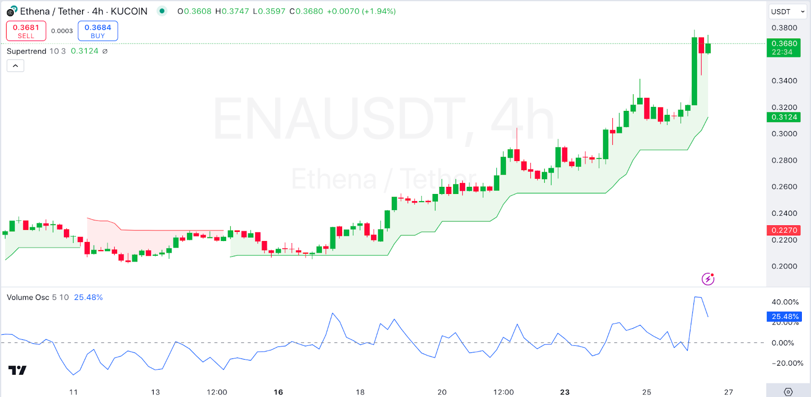 On the other hand, we see that the Volume Oscillator shows increased buying volume, supporting the upward price action. Ethena traded at $0.3706 as of press time, representing a 17.95% increase over the last 24 hours.