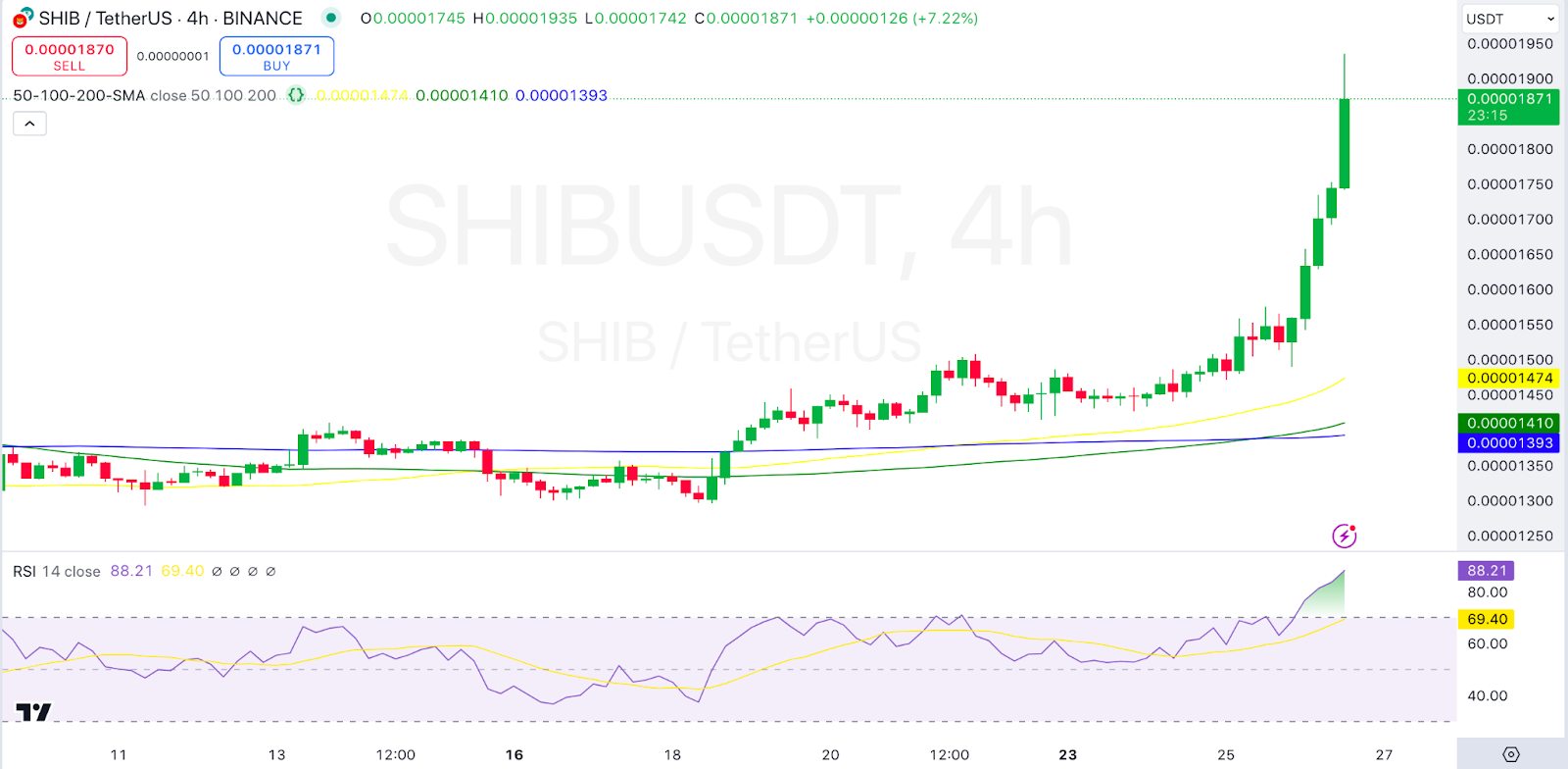 Looking at Moving Averages, we see that SHIB is trading well above the 50, 100, and 200 SMAs, reinforcing the current bullish momentum. Shiba Inu traded at $0.00001869 as of press time, representing a 20.63% increase over the last 24 hours.