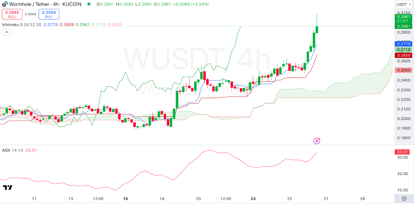 Wormhole, $W, is also among the gainers in today’s session as also seen from its price movements. Looking at an in-depth analysis, we see that the Wormhole price is trading above the cloud, confirming a bullish trend. The conversion line crossing above the baseline further supports this outlook.