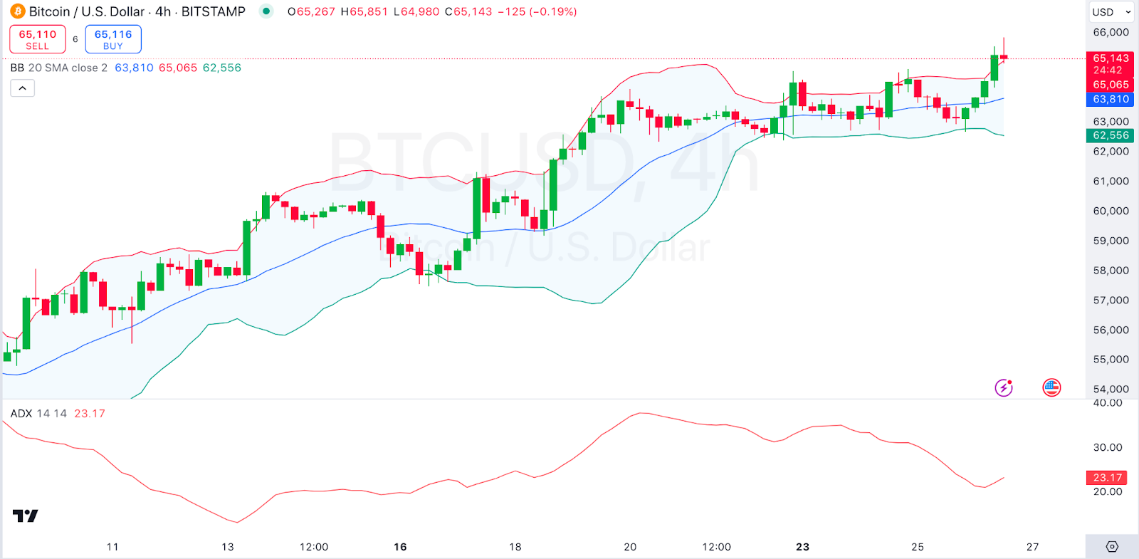 On the other hand, we see that the ADX (Average Directional Index) is at 23.17, suggesting a weak to moderate trend strength. However, if this value increases, it could confirm the continuation of the current bullish trend. Bitcoin traded at $65,085 as of press time, representing a 2.99% increase over the last 24 hours.