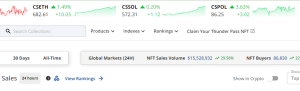 Data compiled by CryptoSlam.io, an on-chain crypto market aggregator and non-fungible token explorer backed by crypto billionaire Mark Cuban, shows that the NFT market has recorded +ve growth today. In the past 24 hours, the NFT market has recorded a trading sales volume of $15 million, up 30% from the previous day. This surge may be attributed to a recent surge in Ethereum and Bitcoin NFTs.