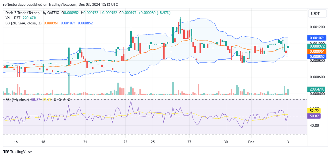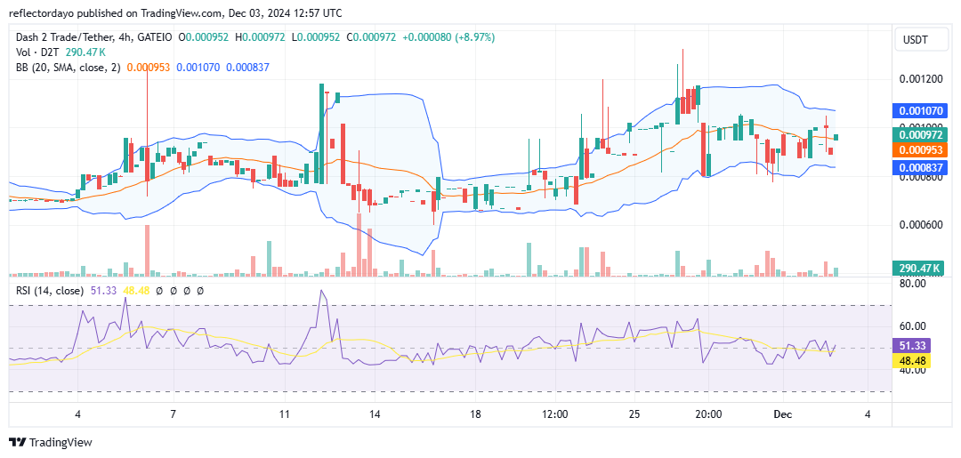 Following the Dash 2 Trade market’s inability to sustain a breakout above the $0.001 price level, the bulls regrouped at the $0.0008 support level. From there, we observed the market rallying upward, once again approaching the critical $0.001 threshold.