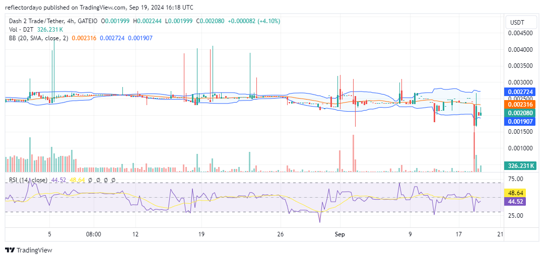 The Dash 2 Trade market is currently in a consolidation phase, though marked by significant volatility. Price action has remained steady at the $0.0025 level for some time, as supply and demand balanced out at this point. Bullish momentum, finding support at the $0.0020 level, surged towards $0.0025, attempting to withstand bearish pressure. Prior to this rally, the market had been signaling the development of a bear trend, with peaks steadily declining from above the $0.004 level. However, the bulls managed to hold the market at $0.0025 temporarily before a breakdown occurred.