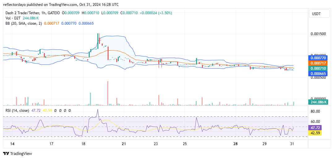 The Dash 2 Trade market continues to resist bearish pressure, even as it remains in a consolidation phase. In the previous analysis, significant activity was observed around the $0.00075 price level. However, today’s trading has seen this struggle shift down to approximately $0.0007. This phase of consolidation is characterized by flat candlestick patterns, signaling a strong sense of indecision within the market.