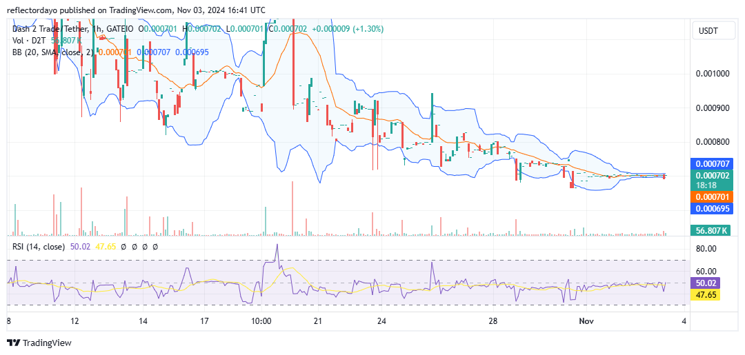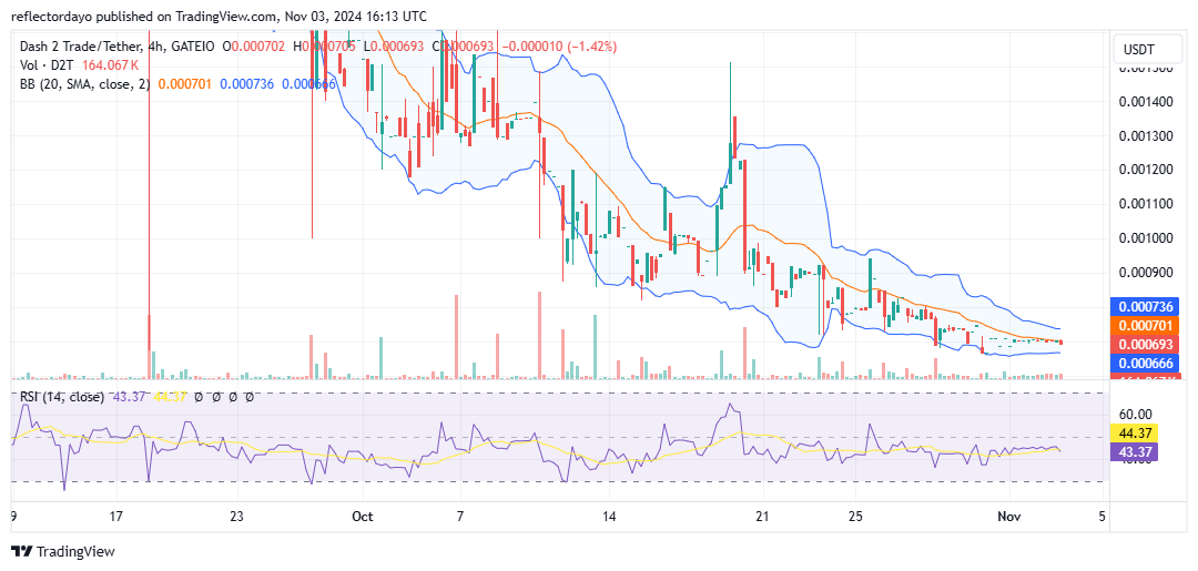 From the 4-hour chart perspective, the market shows price testing lower levels near the $0.0007 threshold. However, this does not necessarily indicate an imminent downward move, as the recent price dynamics have not impacted the Bollinger Bands, which typically reflect market volatility. It appears that the bears may lack the strength to drive the market below the $0.0007 level. Currently, the D2T/USD market is in a state of equilibrium, and any further movement will depend on upcoming market developments.