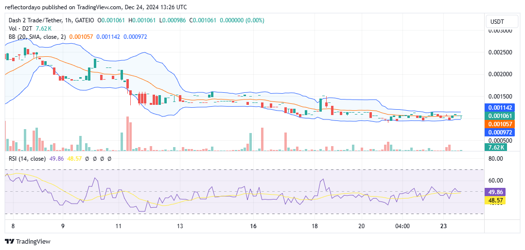 Despite the increasing bearish pressure, the D2T/USD bulls have successfully defended the $0.0010 support level. Observations from the Bollinger Bands show a noticeable convergence, which often signals a period of low volatility and serves as a precursor to a significant price movement.