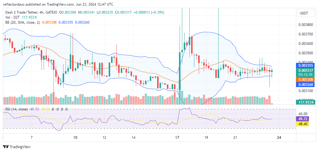Dash 2 Trade has seen a slight rise from $0.0032 to $0.0033, maintaining equilibrium, which also confirms the market sentiment from the 4-hour chart outlook. The price is aligned with the 20-day moving average at $0.0033, while the RSI hovers around 50. This balance indicates that buyers and sellers are evenly matched, despite the current market volatility. Given the emergence of these market dynamics at the bottom of the trend, a bounce in the market may be imminent.