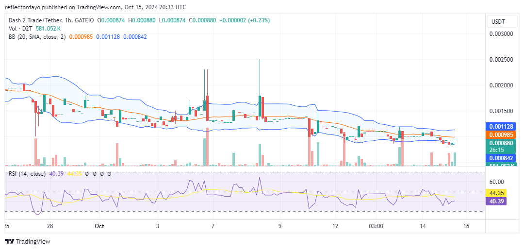 Despite facing strong selling pressure, D2T/USD has managed to hold its ground at the $0.0013 support level. Although the market recently experienced occasional spikes in volatility due to heightened bearish sentiment, bulls have regrouped around the $0.001 mark, trying to maintain control and prevent further declines. With bulls establishing a solid foothold at this key level, the likelihood of a deeper downturn seems limited. Let’s dive into the technical indicators for further insight.