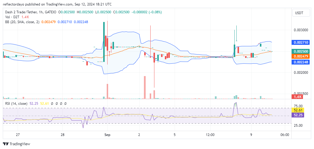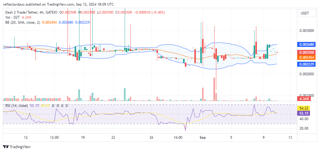 The 1-hour chart displays erratic candlestick patterns, indicating heightened market volatility and a standoff between supply and demand. Notably, the Bollinger Bands show a tilt in the price channel due to the newly established support level at $0.0025. Despite these market challenges, the emerging bullish trend suggests a potential breakout, with the price possibly advancing towards the targeted resistance level. A key next step would be for the price to break above the $0.0026 level, which would signal a shift in favor of the bulls.