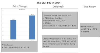 The market’s weakest month was April 2024, and it ended the year or a weak note, down 2.50% in December. Overall, though the index was up 23.31% for the year, and adding the dividend yield of 1.57% (based upon the expected dividends for 2025 and the index at the start of the years) yields a total return 24.88% for the year: