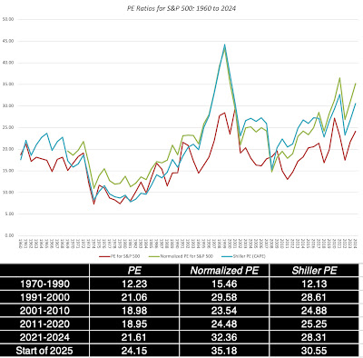 Even as we get new and updated pricing metrics, it is undeniable that the most widely used metric of stock market cheapness or expensiveness is the price earnings ratio, albeit with variations in the earning number that goes into the denominator on timing (current, last 12 months or trailing or next 12 month of forward), share count (diluted, primary) and measurement (ordinary or extraordinary). In the graph below, I focus on trailing earnings for all companies in the S&P 500 and compute the aggregated PE ratio for the index to be 24.16 at the start of 2025, higher than the average value for that ratio in every decade going back to 1970.