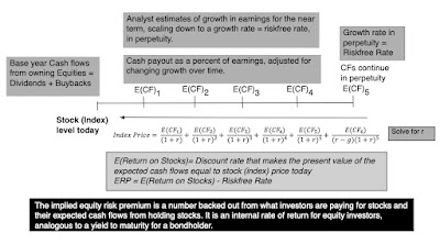 The expected return from this approach will be different from the earnings to price ratio because it incorporate expected growth and changes in cash flow patterns. The critique that this approach requires assumptions about the future (growth and cash flows) is disingenuous, since the earnings yield approach makes assumptions about both as well (no growth or no excess returns), and I will wager that the full ERP approach is on more defensible ground than the earning yield approach.