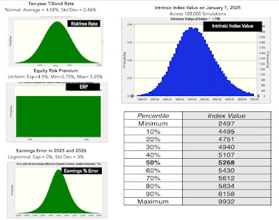 As I see it, there are two major dangers that lurk, with the first being higher inflation (translating into higher treasury rates) and the second being a market crisis that will push up the equity risk premium, since with those pieces in play, the index becomes much more significantly over valued. From an earnings perspective, the risk is that future earnings will come in well below expectations, either because the economy slows or because of trade frictions. Rather than wring my hands about these uncertainties, I fell back on a tool that I use when confronted with change, which is a simulation: