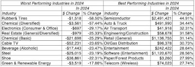 I break the sectors down into 93 industries, to get a finer layer of detail, and there again there are vast differences between winning and losing industry groups, based upon stock price performance in 2024: