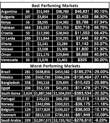 I do have the percentage changes in market cap, by country, but you should take those results with a grain of salt, since there are countries with just a handful of listings, where the returns are distorted. Looking at countries with at least ten company listings, I have a list of the ten best and worst performing countries in 2024: