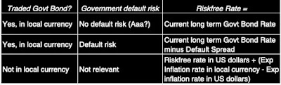 It is the recognition that differences in riskfree rates are primarily due to differences in expected inflation that gives us an opening to estimate riskfree rates in currencies without a government bond rate, or even to run a sanity check on the riskfree rates that you get from government bonds. If you start with a riskfree rate in a currency where you can estimate it (say US dollars, Swiss Francs or Euros), all you need to estimate a riskfree rate in another currency is the differential inflation between the two currencies. Thus, if the US treasury bond rate (4.5%) is the riskfree rate in US dollars, and the expected inflation rates in US dollars and Brazilian reals are 2.5% and 7.5% respectively, the riskier rate in Brazilian reals: