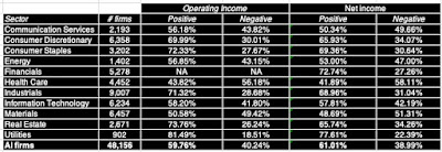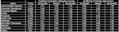It should come as no surprise that utilities have the least volatile operating earnings and have the lowest coefficient of variation on that metric, and that energy and technology haver the most volatile operating income. On a net income basis, financials and utilities have the lowest volatility in earnings, , and energy and communication services have the highest net income volatility.
